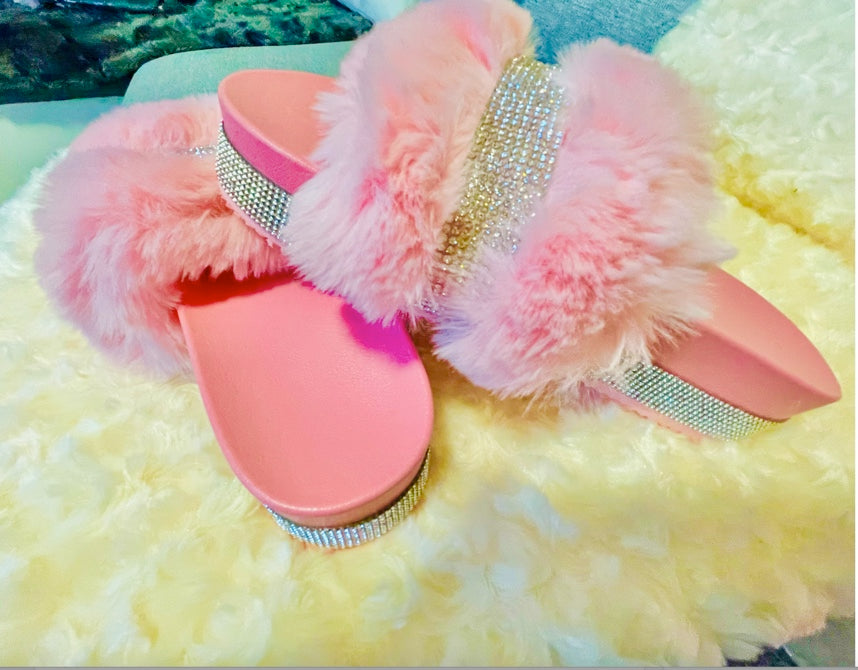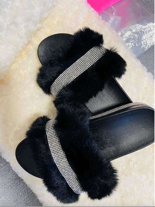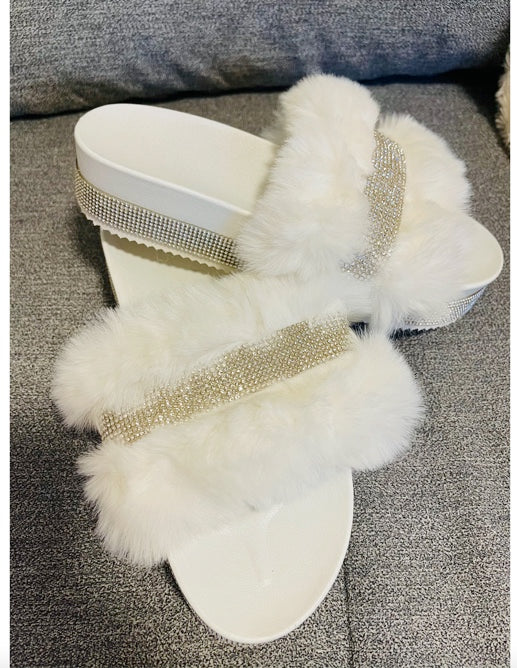 Luxury Design Women Fur Rhinestone Slippers Platform Wedges